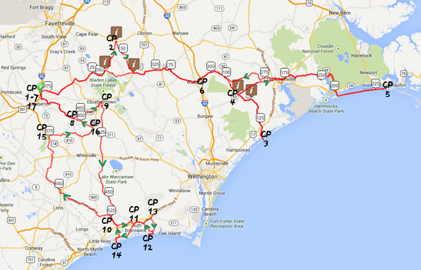 Riders must follow and complete the approved route. This route goes through several small towns in central North Carolina traveling along mostly low traffic roads. There may be some sections where traffic is high, so please ride carefully and safely at all times. The intermediate controls are where stores allow you to refuel with some basic supplies. There are also some other stores along the route where you may be able to stop and get limited nutritional supplies.