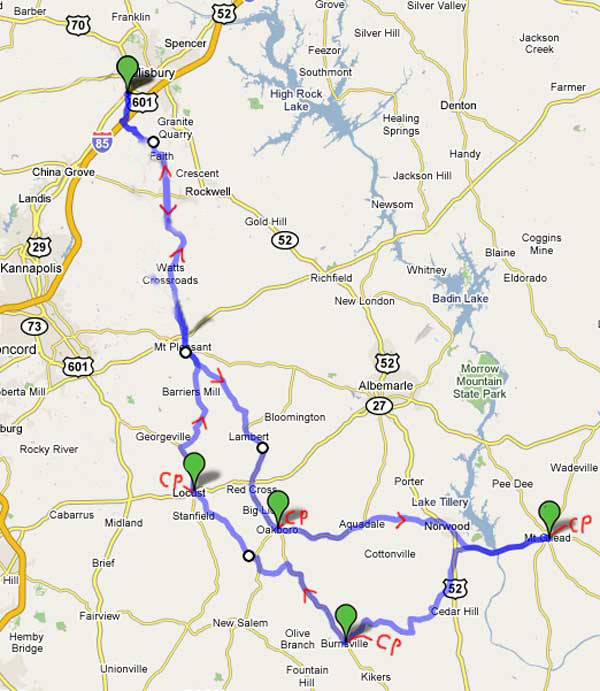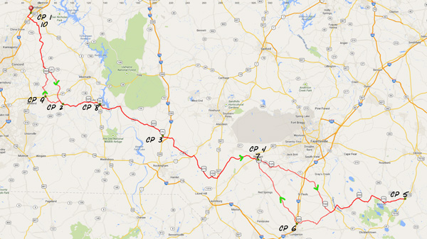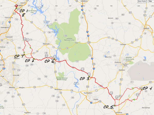 This is an ACP Brevet. The total time allowed from start to finish is 13.5 hours for the 200k and 20 hours for the 300k and 27 hours for the 400k. and 40 hours for the 600k and 75 hours for the 1000k. Riders must follow and complete the approved route. This route goes through several small towns in central North Carolina traveling along mostly low traffic roads. There may be some sections where traffic is high, so please ride carefully and safely at all times. The intermediate controls are where stores allow you to refuel with some basic supplies. There are also some other stores along the route where you may be able to stop and get limited nutritional supplies.
