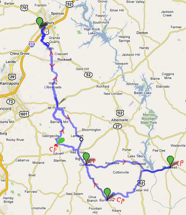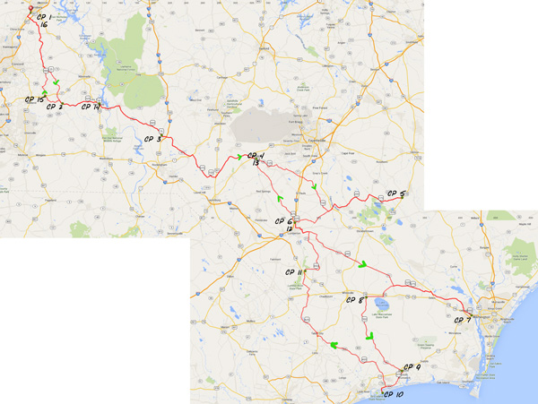 This is an ACP Brevet. The total time allowed from start to finish is 13.5 hours for the 200k and 20 hours for the 300k and 27 hours for the 400k. and 40 hours for the 600k and 75 hours for the 1000k. Riders must follow and complete the approved route. This route goes through several small towns in central North Carolina traveling along mostly low traffic roads. There may be some sections where traffic is high, so please ride carefully and safely at all times. The intermediate controls are where stores allow you to refuel with some basic supplies. There are also some other stores along the route where you may be able to stop and get limited nutritional supplies.