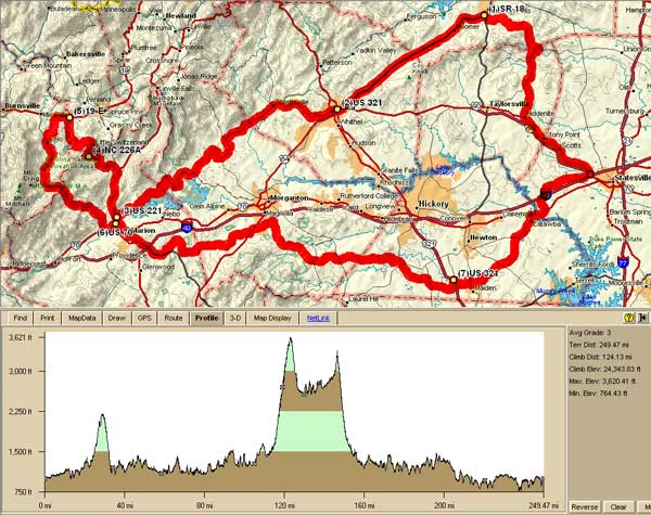 This is an ACP-RUSA Brevet route number 763. The total time allowed from start to finish is 27 hours. The actual distance is approximately 206 Kilometers. Riders must follow and complete the approved route. This route goes through several small towns in central North Carolina traveling along mostly low traffic roads. There may be some sections where traffic is high, so please ride carefully and safely at all times. The intermediate controls are at the Charles, N. Wilkesboro & Charles where stores allow you to refuel with some basic supplies. There are also some other stores along the route where you may be able to stop and get limited nutritional supplies.